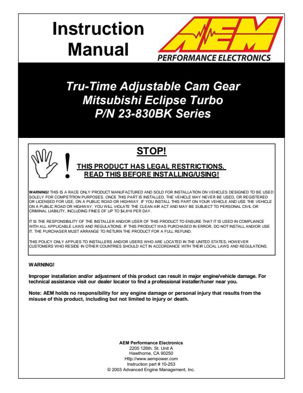 AEM Tru-Time Adjustable Camshaft Gears increase horsepower and torque without having to change the camshaft(s) and are must-have items for engines that are milled, forced induction, high compression and/or utilizing aftermarket competition cams. AEM Tru-Time cam gears enable users to match cam timing with their vehicle's tuning state by advancing or retarding the cam profile(s) in one-degree increments via true laser-etched markings. Precision-cut gear teeth ensure no premature wearing of the cam gear's belt surface and AEM's anodizing on the adjustable cam gear's teeth is lab-test proven as the hardest anodizing process on the market.