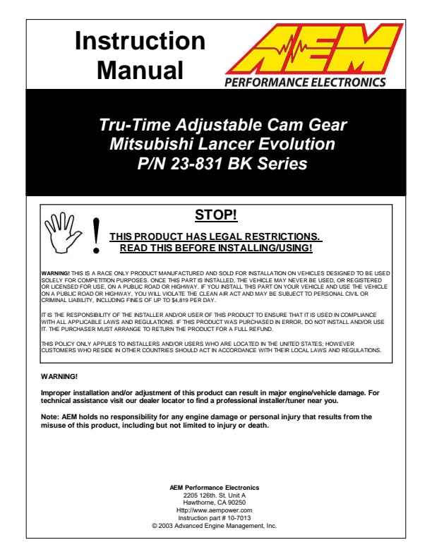 AEM Tru-Time Adjustable Camshaft Gears increase horsepower and torque without having to change the camshaft(s) and are must-have items for engines that are milled, forced induction, high compression and/or utilizing aftermarket competition cams. AEM Tru-Time cam gears enable users to match cam timing with their vehicle's tuning state by advancing or retarding the cam profile(s) in one-degree increments via true laser-etched markings. Precision-cut gear teeth ensure no premature wearing of the cam gear's belt surface and AEM's anodizing on the adjustable cam gear's teeth is lab-test proven as the hardest anodizing process on the market.