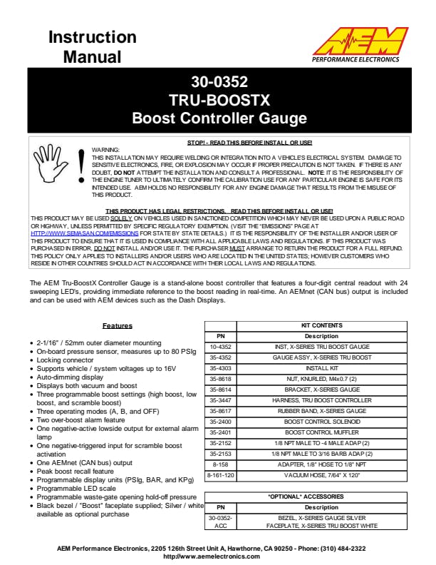 All AEM Tru-Boost gauge programming is done using the faceplate buttons and no laptop is required. AEM's specially designed Boost Control Solenoid and all necessary hardware is included.Program Two Boost Levels + Scramble Boost Setting - Program two boost modes for different levels of performance (up to 80PSIg internal MAP sensor), and program a time-based scramble boost setting that is controlled using a switched input. You can also turn off the controller and use the gauge as a display.Change Wastegate Open Pressure-Ideal for reducing boost spikes and improving spool up.Display Boost Levels in PSIg (PSI), BAR or kPa (PAS) -See your boost in the units you prefer, and scale the 24 outer LEDs to match your peak boost levels for the perfect sweeping motion.Set Alarms and Display Peak Boost-Set the 24 green outer LEDs to flash based on boost pressure so you are alerted to an overboost condition. A ground output is included for triggering an optional LED warning light. Select the "B" button to see peak boost level and clear the value using the menu.Overboost Protection Built In-Protects your engine from an overboost condition by shutting the boost control solenoid off until it is reactivated by you through the buttons on the faceplate.Integrated Error Protection-Alerts you to a fault if the boost control solenoid is shorted or disconnected so you are never left guessing whether the Tru-BoostX is operational.Datalog using AEMnet CAN bus-Outputting channels over AEMnet provides so much more than just boost pressure! Send 13 channels of data over a 2-wire connection, including boost pressure, peak boost, boost target, boost scramble duty, overboost status, wastegate crack pressure, boost control solenoid status and more.