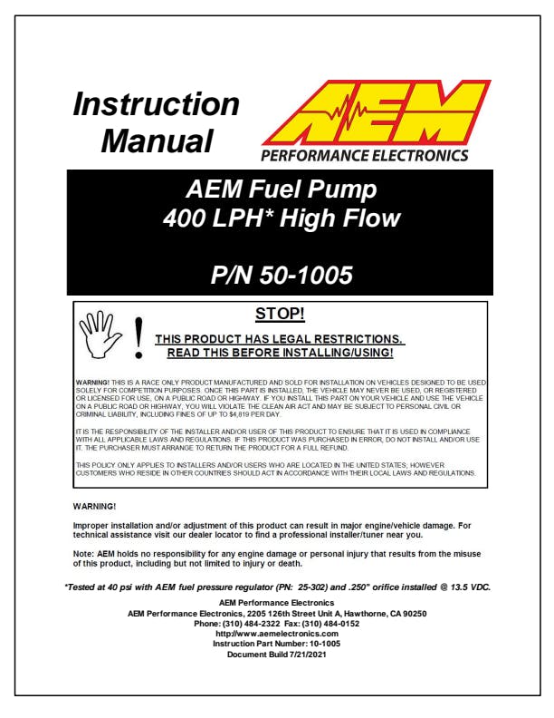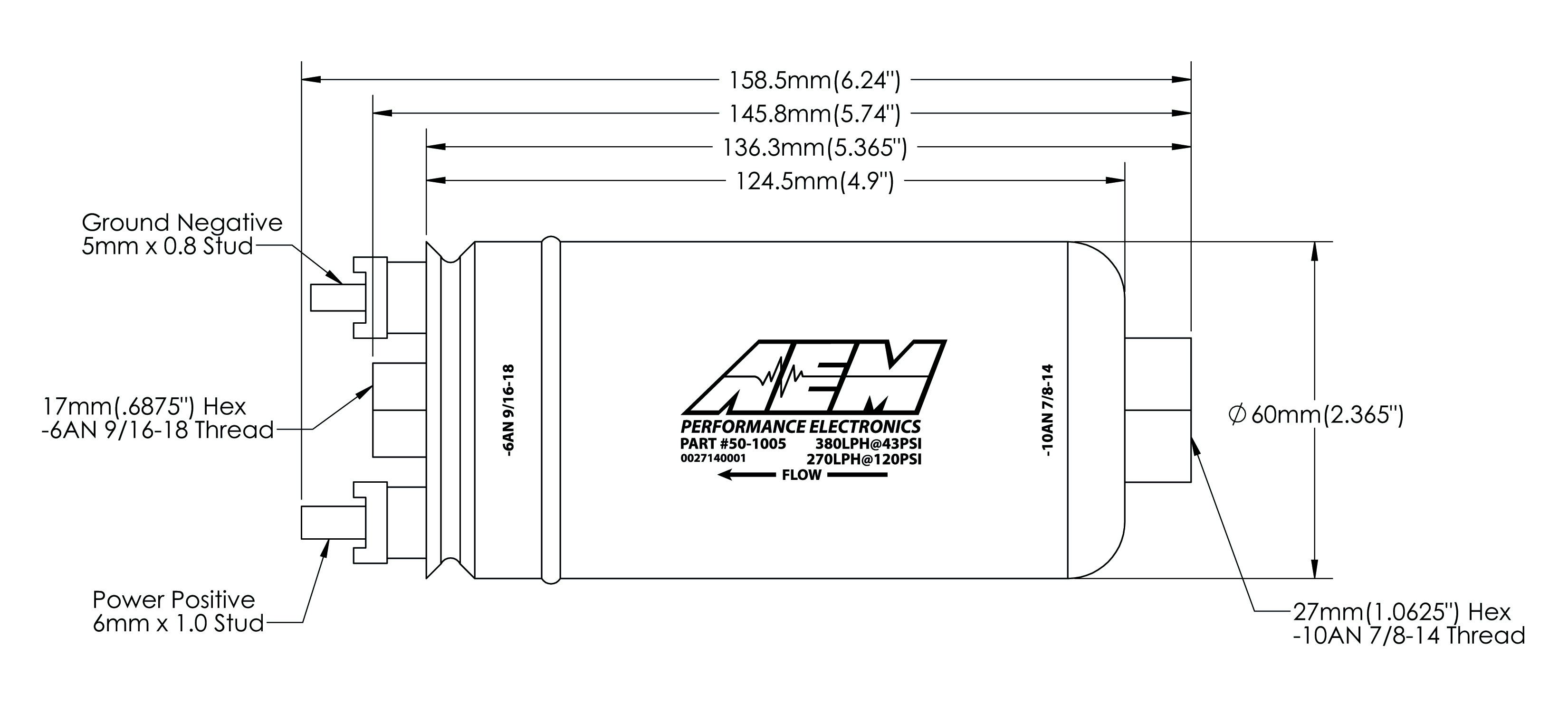 AEM's 400LPH AN Fittings High Flow, High-Pressure Inline Fuel Pump is designed for high performance naturally aspirated and forced induction EFI vehicles. It can be installed externally or in-tank using optional hardware that is sold separately (see part numbers, below). It utilizes the industry standard "044 Style" envelope and -10 AN female inlet and -6 AN female outlet connections for easy installation on new applications and for quick replacement of existing competitor fuel pumps. The 50-1005 fuel pump delivers incredible performance and value.AEM's 400LPH High Flow, High-Pressure Fuel Pump (AEM 50-1005) is capable of supporting over 1,200 HP normally aspirated and a whopping 860 HP at 30 psi boost.* It flows 400LPH (100 gph) at 40 PSI, 340LPH (90 gph) at 73 PSI, and 270LPH (71 gph) at 120 PSI. Complete flow curves from 35 to 120 PSI and current draw vs. fuel pressure charts are available in the Specs section, below.The AEM 400LPH AN Fittings High Flow Fuel Pump is rated for use with ethanol-blended fuels, (E85/E90) and all types of gasoline, but pump life will be diminished if used with 100% ethanol fuels. The inlet thread is a -10 AN female ORB (O-ring port fitting) and the discharge is a female -6 AN ORB (O-ring port fitting).A male -6 to -8 AN discharge fitting with integral high-pressure check valve, terminal nuts, terminal boots and installation instructions are included. Optional accessories that are sold separately include a -10 ORB fitting inlet pre-filter (for use with in-tank installations), and both -8 and -6 discharge adapters without integral check valves. Accessory fittings are hard anodized.