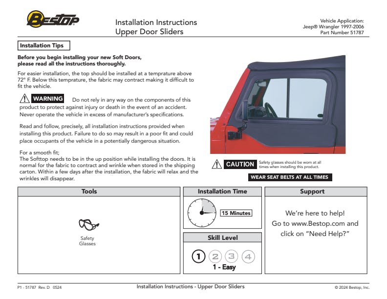 It's cold outside, you're at the toll booth ready to throw change into the hopper and the struggle begins to unzip that vinyl window. And then you have to try and zip it up while pulling out or risk the wrath of horn-honkers behind you. Stop struggling and start using Bestop Upper Door Sliders. You can just slide a glass panel open, do your thing and then just as quickly, slide it shut. This is the perfect accessory for 1997-2006 Wrangler soft top owners with fabric upper doors. This is one of our best-selling cold weather products.