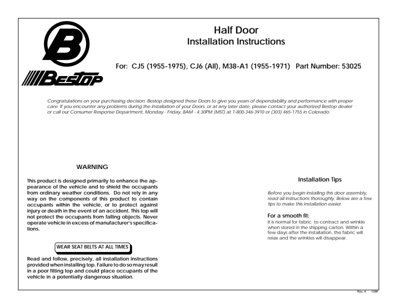 - Note: HALF DOORS are are designed for use as lower half only. Bestop Upper Door Kits can't be used in conjunction with Lower Half Doors. If you are interested in combining upper and lower doors, check out our 2-Piece Fabric Door Kits