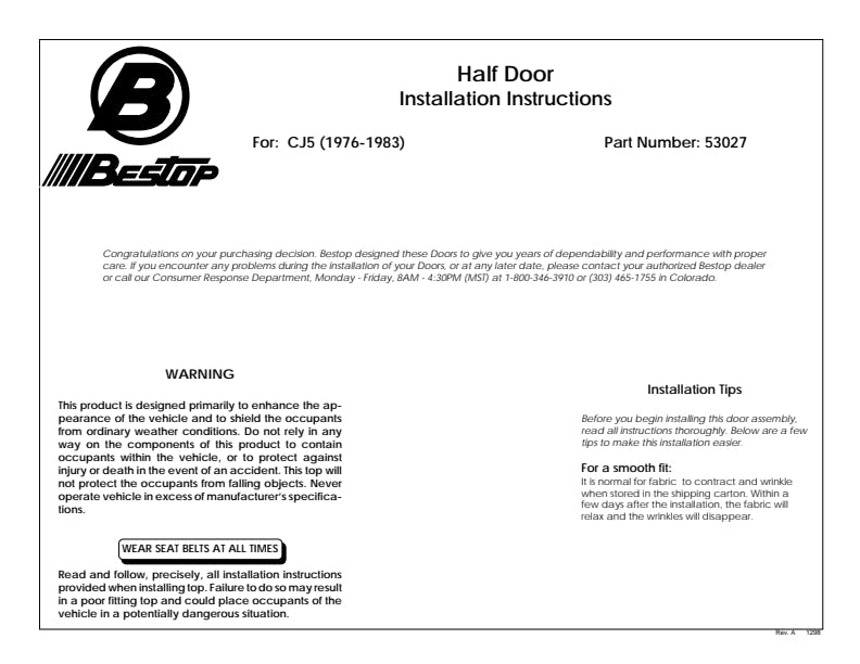 - Note: HALF DOORS are are designed for use as lower half only. Bestop Upper Door Kits can't be used in conjunction with Lower Half Doors. If you are interested in combining upper and lower doors, check out our 2-Piece Fabric Door Kits