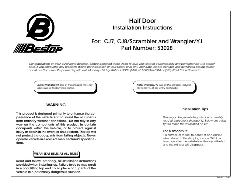 - Note: HALF DOORS are are designed for use as lower half only. Bestop Upper Door Kits can't be used in conjunction with Lower Half Doors. If you are interested in combining upper and lower doors, check out our 2-Piece Fabric Door Kits
