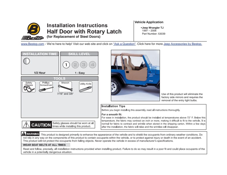 - Note: HALF DOORS are are designed for use as lower half only. Bestop Upper Door Kits can't be used in conjunction with Lower Half Doors. If you are interested in combining upper and lower doors, check out our 2-Piece Fabric Door Kits
