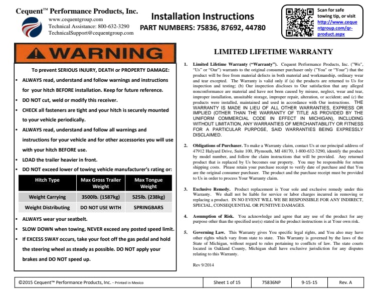 Draw-Tite custom-fit hitches are built according to manufacturer vehicle weight specifications and model year to ensure a perfect fit and top towing performance. Featuring solid all-welded construction for maximum strength and safety, every hitch meets and exceeds industry standards. 2" Square Receiver Tube Opening Max-Frame receivers are designed for trucks, vans and sport utility vehicles Neat Appearance, All Frame Attachments E-Coat Base w/ Black Powder Coat Finish Rated up to 3,500 lbs. (GTW) Weight Carrying (WC)Rated up to 5,250 lbs. (GTW) Weight Distributing (WD) Solid All-Welded Construction for Maximum Strength and Safety Custom Built According to Manufacturer & Model Year Ensures Perfect Fit and Top Towing Performance Computer-Aided Design and Fatigue Stress Testing Designed to Withstand Road Abuse Within Specified Capacities Backed by a Nationwide Limited Lifetime Warranty