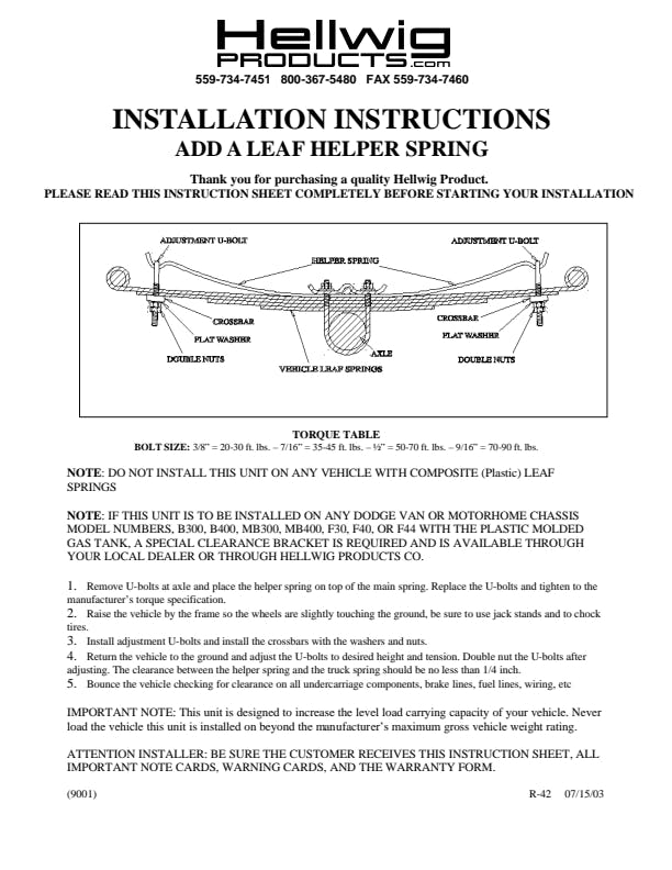 Hellwig's medium-duty EZ-990 Helper Springs pack a lot of capability in every box. Packaged complete with the same heavy duty powder coated and plated components, hardware and installation instructions as our heavy duty helper spring products, these kits are designed for the vehicles that need lighter assistance in carrying a load. Simple bolt on design using common hand tools provide the installer ease of installation and the vehicle owner hassle free use. Ideally suited for light towing and loads, these units are fully adjustable using the heavy duty U-bolts included in the kit using simple hand tools. If your tow and haul needs change, simply adjust the heavy duty U-bolts to suit the new load requirements. Once installed and adjusted you are free to haul or tow with greater control and stability. Manufactured with heat treated ASTM 5160 alloy spring steel in our California based facility, these units are rated up to 2,000 lb. level loadcarrying capacity. They are a great cost effective spring solution and can be adjusted independently for uneven side to side loads.