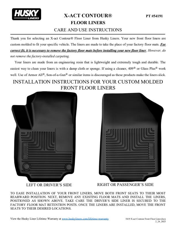 Nothing fits your vehicle better or protects longer than Husky X-act Contour?. These liners combine laser-scanned, exact fit with a no-slip, DuraGrip? surface and a softer feel. Plus, the rock-solid stability delivered by your vehicle?s factory retention posts, and our StayPut? Nibs for a no-slip, no-slide, surface with absolutely zero compromise in protection. They?re built to stand up to whatever you?re laying down? including chemicals like battery acid and oil, with our FormFit Edge? to keep whatever spills contained for easy cleanup. Available in black. Built for a lifetime of rugged abuse, warrantees the same.