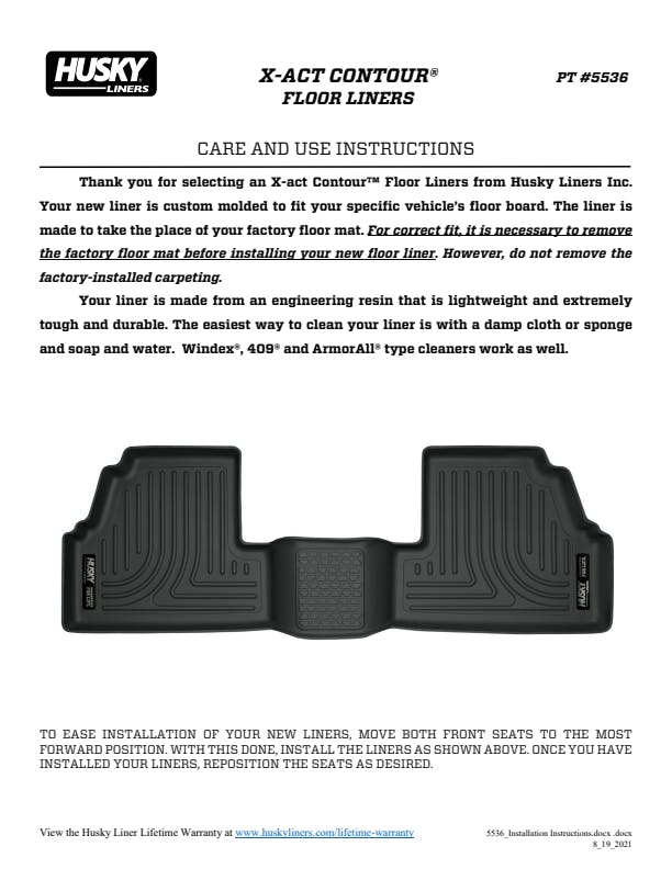 Nothing fits your vehicle better or protects longer than Husky X-act Contour?. These liners combine laser-scanned, exact fit with a no-slip, DuraGrip? surface and a softer feel. Plus, the rock-solid stability delivered by your vehicle?s factory retention posts, and our StayPut? Nibs for a no-slip, no-slide, surface with absolutely zero compromise in protection. They?re built to stand up to whatever you?re laying down? including chemicals like battery acid and oil, with our FormFit Edge? to keep whatever spills contained for easy cleanup. Available in black. Built for a lifetime of rugged abuse, warrantees the same.
