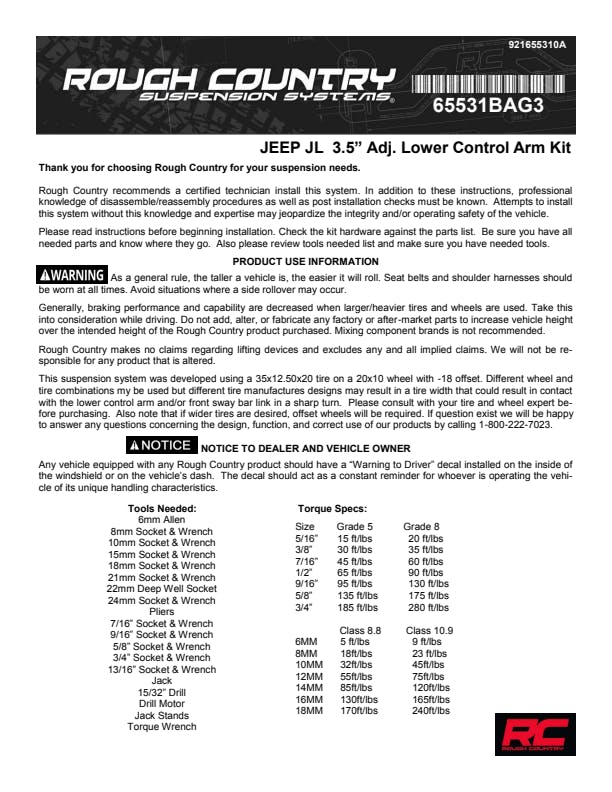 Put the finishing touch on your Jeep Wrangler JL with Rough Country's 2.5-Inch Suspension Lift Kit, designed for the 4-door model and offering enough clearance to easily run 35-inch tires. This kit is your ticket to taking your JL to new heights with a rugged, trail-ready stance. Level Up Your Ride: Eliminate the factory nose-dive and achieve a sleek, leveled appearance. This lift kit levels the front with the rear, giving your Jeep a commanding, off-road-ready profile. Improved Off-Roading Performance: Gain the extra ground clearance you need to tackle tough trails with confidence. Optimized approach, breakover, and departure angles keep your JL performing in challenging terrain. Ride Improvement: Linear coil rate springs enhance handling and load support, improving your Jeep's ride both on and off the trail. Custom Shock Options: Configure your lift with your choice of nitrogen-charged N3 shocks, V2, M1 Monotube, or premium M1R shocks to perfectly match your driving style, from daily comfort to serious off-road performance. Additional Tire Clearance: This kit clears up to 35-inch tires, giving your Jeep a bold, aggressive look that turns heads wherever the adventure takes you. Easy Bolt-On Installation: A simple, 100% bolt-on design means no complicated modifications, so you can hit the trails faster and enjoy your new stance with confidence.