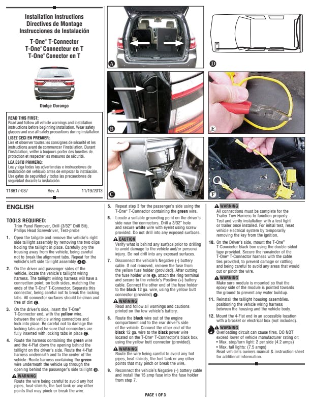 T-One Connectors require no splicing of vehicle wires. Simply locate your vehicles wiring harness connector, unplug the connection and insert the T-One Connector into the vehicle's harness. No special tools required. Factory appearanceQuick and easy installationSolid, weatherproof, one-piece constructionNo cutting, splicing or taping of vehicle wiresIncludes converter where needed16 gauge bonded wire with 4-Flat plug & capStop/Turn circuit capacity of 4.2 AmpsTaillight circuit capacity of 7.5 Amps1 year limited warrantyStop/Turn circuit capacity of 4.2 Amps