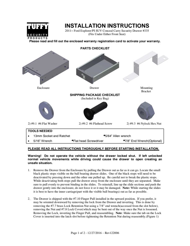 This high security 16 gauge steel security drawer mounts under the drivers or passengers side seat in a Ford Explorer (NOTE: does not fit Explorer Sport or ST models). The formfitting design of the Tuffy lockbox has over 200 cubic inches of lockable storage with no need to reroute under seat wiring harnesses. It's secured contents are easily accessed by maneuvering the drawer open and closed on the smooth ball bearing slides using the convenient pull lever. Featuring Tuffy's Pry-Guard Locking System with a 10 tumbler double bitted security lock with built in weather seals. The design incorporates a heavy duty fully extending slide system, weather seal and welded construction. A formed rib in the enclosure additionally strengthens the locking system. Tuffy's exclusive bolt-blocker bracket is included for additional security. Mounts inconspicuously under the seat out of apparent site of would be thieves.