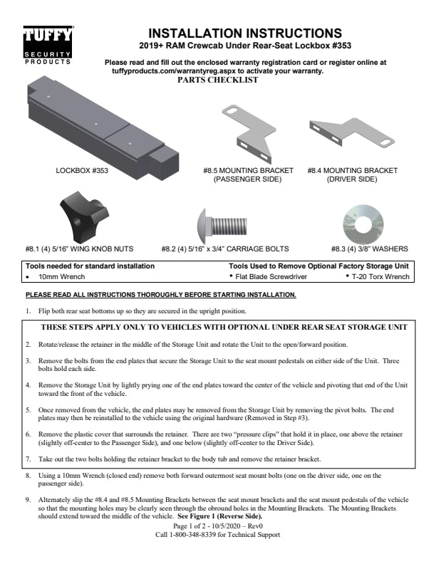 Organize your 2019-2024 Ram 1500 Crew Cab truck with the Tuffy under-seat lockbox. This high security welded steel security lockbox has a full width formfitting design creating over 3,000 cubic inches of lockable storage. Easily access your secured gear by flipping up the lid of your 60/40 split bench seat. The unique design allows the full width under the seat to be used to organize and secure whatever life demands of you. Provide additional organizational options by adding a set of twist-to-lock pressure fit dividers, specifically designed for your RAM lockbox. Feel confident securing your gear using Tuffy's Pry-Guard Locking System with three-digit combination security locks with built in weather seals. Mounts inconspicuously under the seat out of sight of opportunistic thieves. Declutter your space by quickly and easily installing this Tuffy lockbox using the factory hardware without drilling.