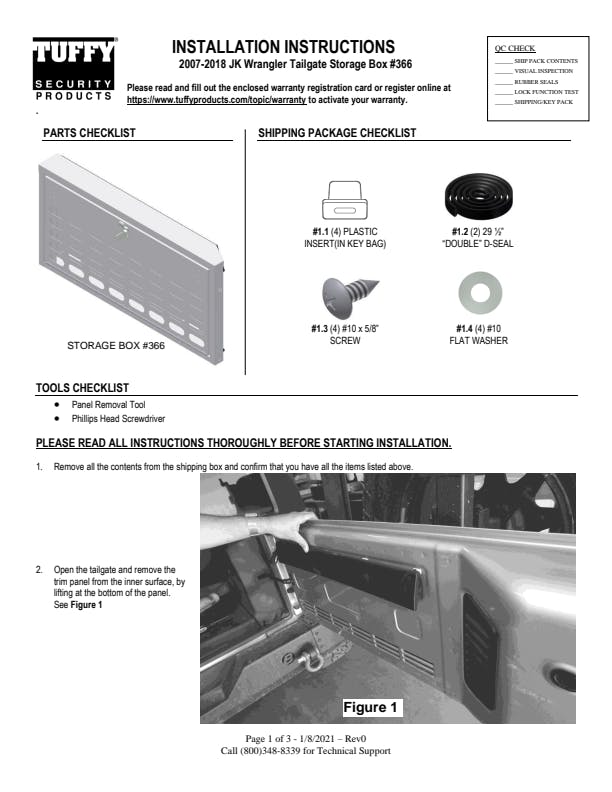 This heavy duty, high security lock box mounts on the inside of the Jeep Wrangler JK tailgate providing ample secure storage for tools and other gear. The door folds down creating a work table for cooking or quick sorting and access of your stuff. The entire Tuffy JK Tailgate Lock Box is constructed using welded 18-gauge steel, heavy duty fasteners and is covered with a durable textured powder coat finish. The JK Tailgate Lock Box installs to the JK Tailgate Rail mounts using standard hand tools with or without an OEM hardtop. Featuring Tuffy’s Pry-Guard Locking System with a 10-tumbler double bitted security lock with built in weather seals.