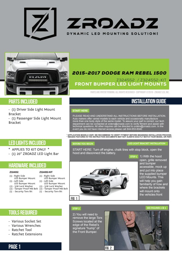 ZROADZ Front Bumper LED Mounts and kits are a quick and easy way to add forward facing lighting to your vehicle. The simple bolt on installation uses factory bolt locations and provides significant auxiliary lighting. Typical installation time is under 30 minutes and can be successfully installed using common hand tools by even the most casual enthusiast. ZROADZ Front Bumper LED Mounts are available in complete kits with light and wiring harness, or as brackets only for mounting common and popular LED light bars. ZROADZ Front Bumper LED Mounts are designed and made in USA.