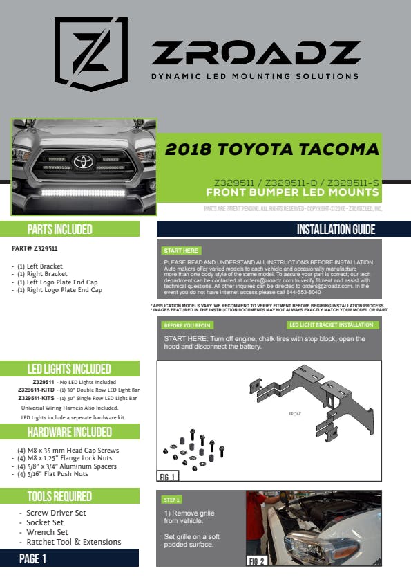 ZROADZ Front Bumper LED Mounts and kits are a quick and easy way to add forward facing lighting to your vehicle. The simple bolt on installation uses factory bolt locations and provides significant auxiliary lighting. Typical installation time is under 30 minutes and can be successfully installed using common hand tools by even the most casual enthusiast. ZROADZ Front Bumper LED Mounts are available in complete kits with light and wiring harness, or as brackets only for mounting common and popular LED light bars. ZROADZ Front Bumper LED Mounts are designed and made in USA.